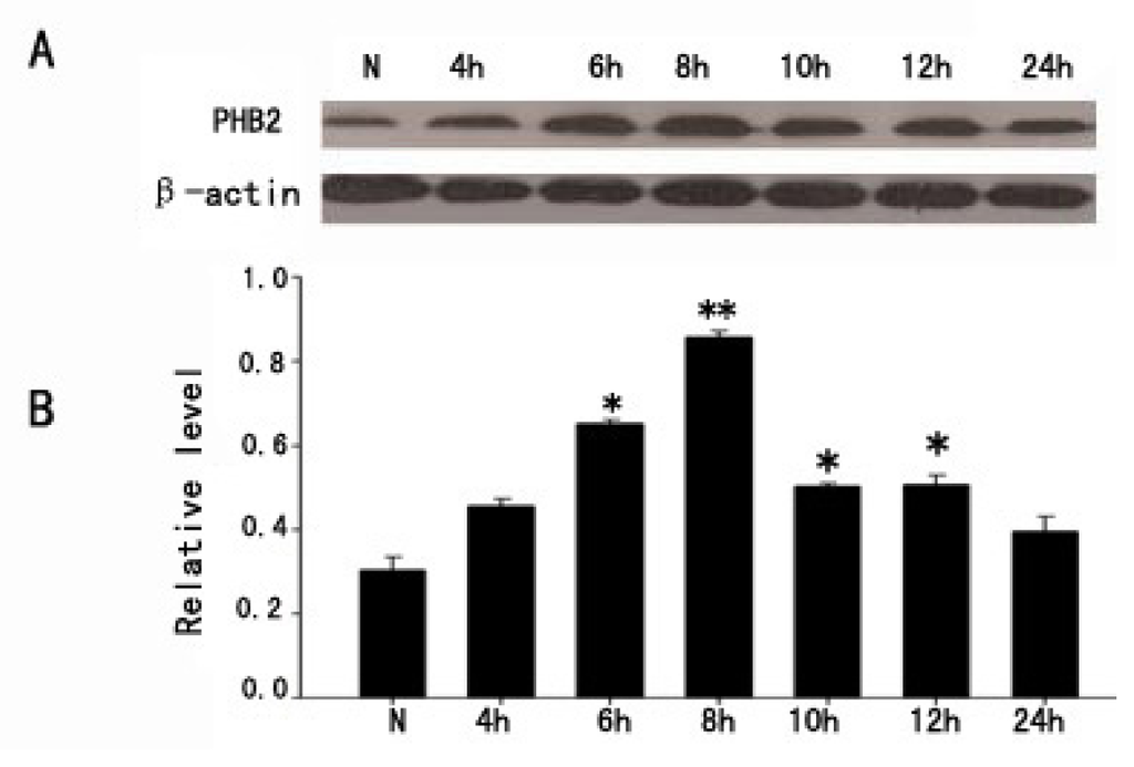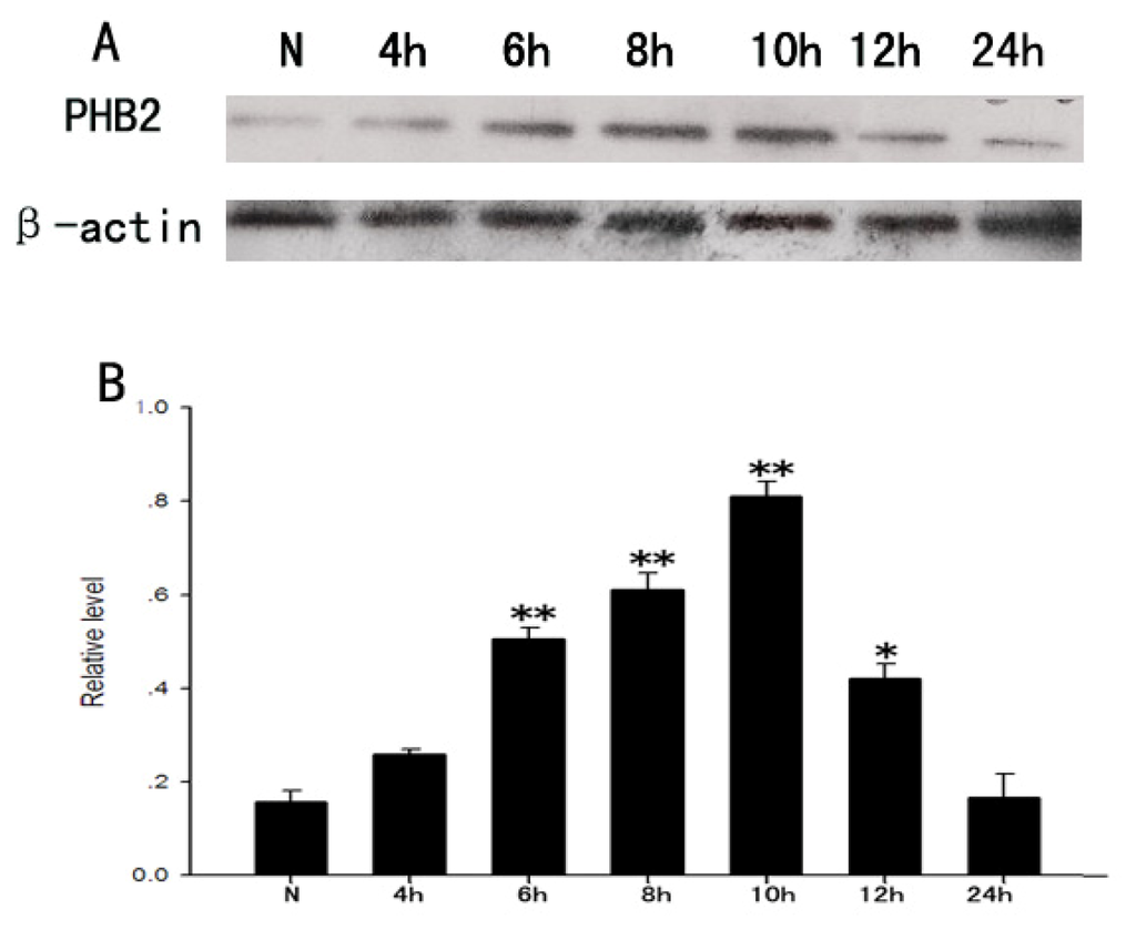 The expression change of PHB2 in H2O2-induced PC12 cells apoptosis. (A) The time courses of PHB2 expressions in PC12 cells after H2O2 stimulus; β-actin was used to confirm equal amounts of protein run on gel; (B) Quantification was made at each time point, the bar chart showed the ratio of PHB2 to β-actin at each time point; these data are means ± SEM. * p < 0.05, ** p < 0.01 (n = 3).