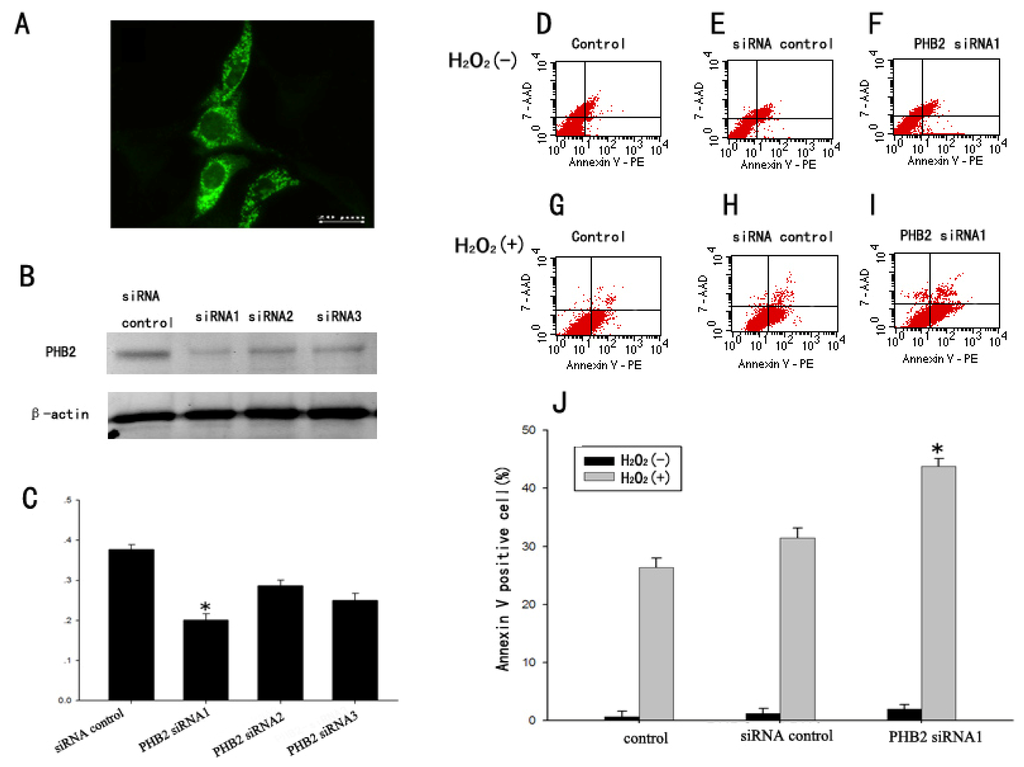 Immunofluorescence was applied to identify the localization of PHB2 in PC12. Results showed that PHB2 was mainly localized in the cytoplasm of PC12 cells (Figure 8A). It has been demonstrated that PHB2 is expressed in both the nucleus and cytoplasm. The PHB2 in the cytoplasm can interact with cell apoptosis-regulated protein HAX-1 to protect cells from apoptosis. We proposed that PHB2 may play a protected role in PC12 apoptosis induced by H2O2. Similar to above, we transfected PC12 cells with siRNA to knockdown PHB2 expression. As shown by Western Blot analysis, siRNA1 made a significant effect in reducing PHB2 expression (Figure 8B,C).