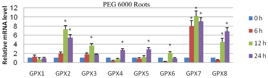 2.3. Expression Analyses of GPX Genes in T. salsuginea Plants Exposed to High Salinity and Osmotic Treatment