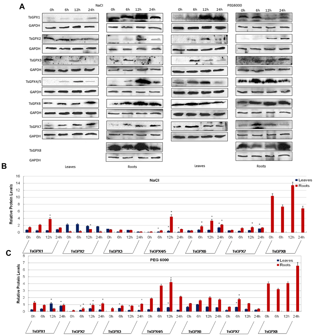 2.4. Protein Expression Analyses of GPX Genes in T. salsuginea Plants Exposed to High Salinity and Osmotic Treatments