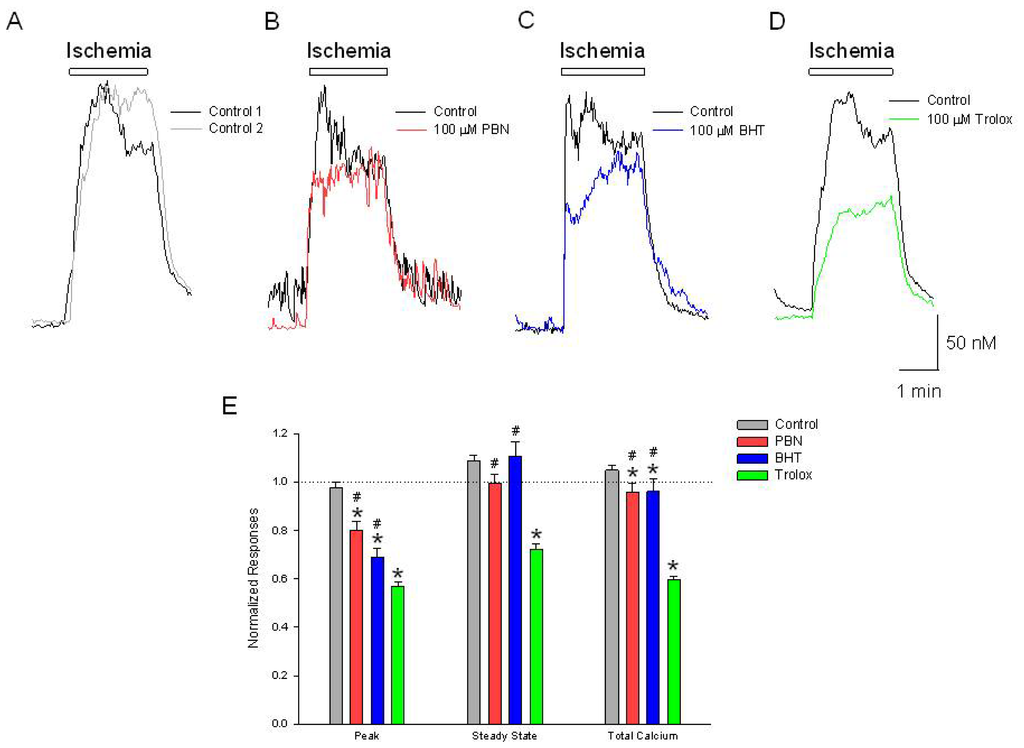 Ischemia produces increases in [Ca2+]i, are differentially inhibited by Phenyl-N-tert-butylnitrone (PBN), butylated hydroxytoluene (BHT) and trolox. Representative traces of [Ca2+]i, as a function of time during a (A) 2 min application of NaN3 in the absence of glucose. The initial ischemia induced elevation in [Ca2+]i (black trace) was reproducible following a 20 min washout period (gray trace); In separate experiments, following the control ischemic responses (black traces), a 20 min incubation in (B) 100 μM PBN or (C) 100 μM BHT inhibits the initial ischemia-induced increase in [Ca2+]i, (red and blue traces) while (D) 100 μM trolox inhibits the initial as well as the steady state increases in [Ca2+]i (green trace); (E) Summarizing experiments identical to (A–D), second responses recorded in the absence and presence of the three antioxidants were normalized to initial control responses and expressed as means ± S.E.M. Peak, initial [Ca2+]i increase relative to baseline; Steady State, [Ca2+]i measured at end of ischemic episode, relative to baseline; Total Calcium, integration of [Ca2+]i increases from beginning of ischemic event to end of record. One way ANOVA comparison was performed on ratios of test responses/control responses. * p < 0.5 compared to control, and # p < 0.5 compared to trolox. Number of cells measured; Control, n = 225; PBN, n = 93; BHT, n = 131; Trolox, n = 107.