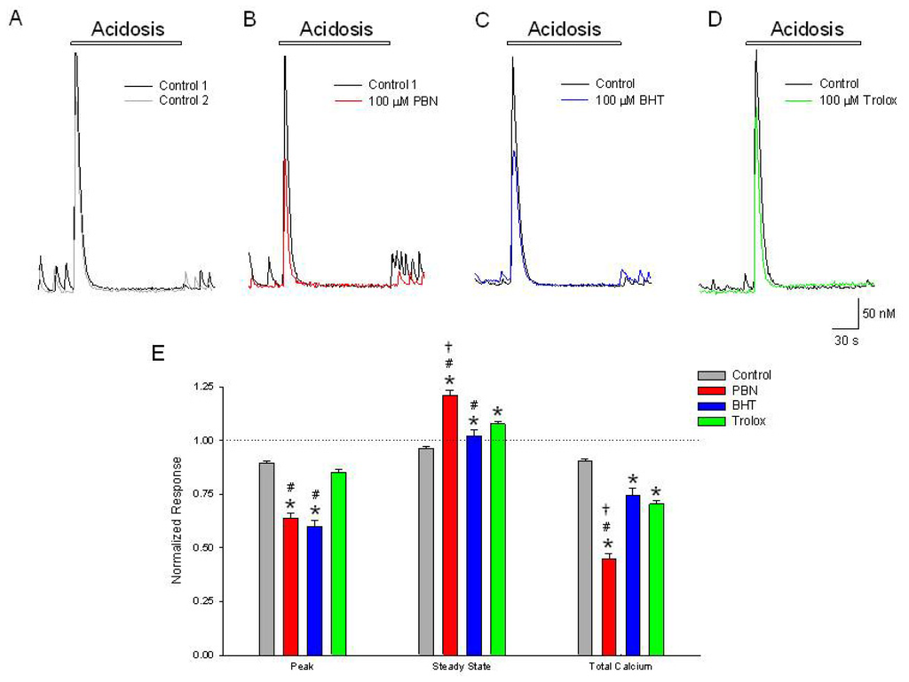 Initial [Ca2+]i, increases in response to acidosis are inhibited by PBN and BHT but not trolox. Representative traces of [Ca2+]i, as a function of time during a (A) 2 min change in external pH from 7.4 to 6.0 (black trace). Following a 20 min washout, a second acidosis insult (grey trace) induces an approximately 20% reduced elevation in [Ca2+]i. In separate experiments, following the control acidosis application (black traces), a 20 min incubation in (B) 100 μM PBN (red trace) or (C) 100 μM BHT (blue trace) produced decreases in the initial acidosis-induced increases in [Ca2+]i, greater than observed under control conditions; (D) 100 μM trolox failed to significantly decrease the initial increase in [Ca2+]i compared to control but did produce an elevated steady state level (green trace); (E) Summarizing experiments identical to (A–D), second responses recorded in the absence and presence of the three antioxidants were normalized to initial control responses and expressed as means ± S.E.M. Peak, initial [Ca2+]i increase relative to baseline; Steady State, [Ca2+]i measured at end of acidic episode, relative to baseline; Total Calcium, integration of [Ca2+]i increases from beginning of acidic event to end of record. One way ANOVA comparison was performed on ratios of test responses/control responses. * p < 0.5 compared to control, # p < 0.5 compared to trolox, † p < 0.5 compared to BHT. Number of cells measured; Control, n = 280; PBN, n = 107; BHT, n = 138; Trolox, n = 234.