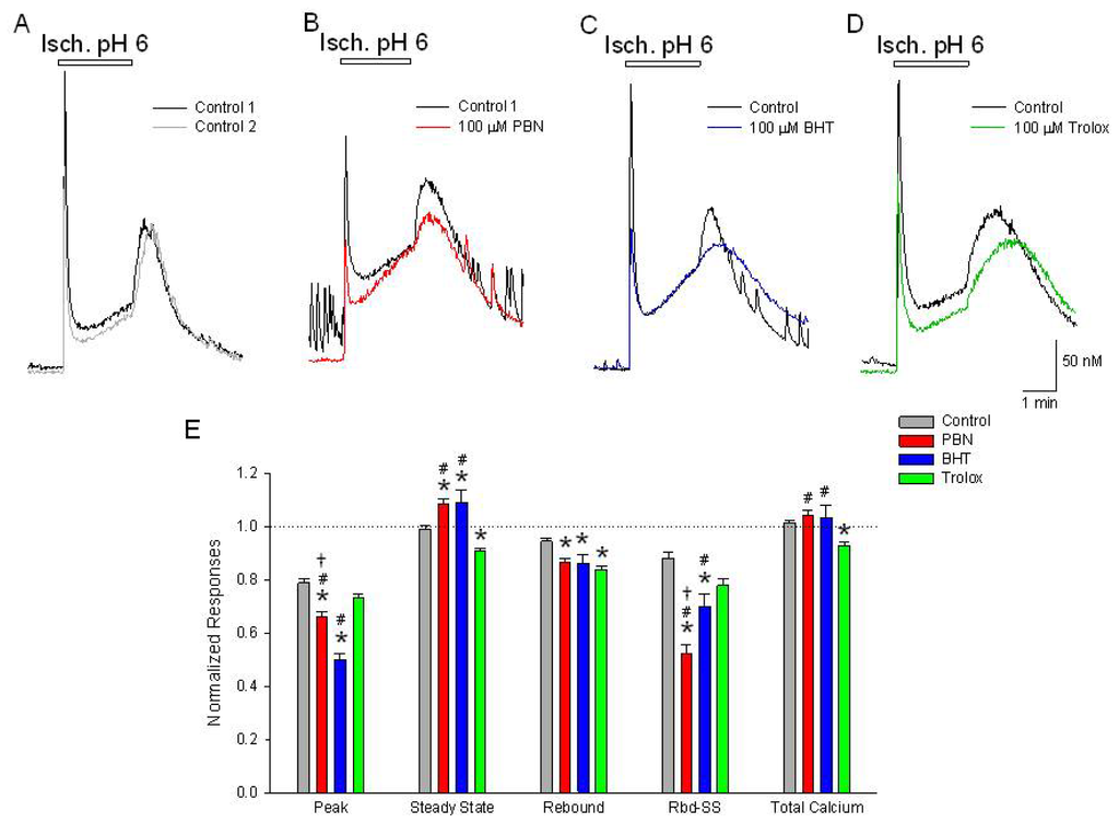 Initial [Ca2+]i, increases in response to acidic ischemia are inhibited by PBN and BHT. Representative traces of [Ca2+]i, as a function of time during a (A) 2 min application of glucose-free PSS pH 6.0 with 4 mM NaN3 (black trace). Following a 20 min washout, a second application of acidic ischemia induces an approximately equal [Ca2+]i response except for a 20% reduction of the initial peak elevation (grey trace). In separate experiments, following the control acidic ischemia application (black traces), cells were incubated for 20 min in (B) 100 μM PBN or (C) 100 μM BHT prior to a second acidic ischemia insult which produced decreases in the initial elevations in [Ca2+]i and in the rebound peaks following washout, but increased the steady state levels, measured immediately prior to washout, compared to control conditions (red and blue traces, respectively). Incubation in 100 μM trolox (D) failed to significantly decrease the initial increase in [Ca2+]i compared to control but did produce a decrease in the rebound peak (green trace); (E) Summarizing experiments identical to (A–D), second responses recorded in the absence and presence of the three antioxidants were normalized to initial control responses and expressed as means ± S.E.M. Peak, initial [Ca2+]i increase relative to baseline; Steady State, [Ca2+]i measured at end of acidic ischemia episode, relative to baseline; Rebound, [Ca2+]i increase observed after acidic ischemia event measured from baseline (pre-acidic ischemia); Rbd-SS, [Ca2+]i increase observed after acidic ischemia event measured from steady state level (end of acidic ischemia); Total Calcium, integration of [Ca2+]i increases from beginning of acidic ischemia event to end of record. One way ANOVA comparison was performed on ratios of test responses/control responses. * p < 0.5 compared to control, # p < 0.5 compared to trolox, † p < 0.5 compared to BHT. Number of cells measured; Control, n = 271; PBN, n = 107; BHT, n = 176; Trolox, n = 128.