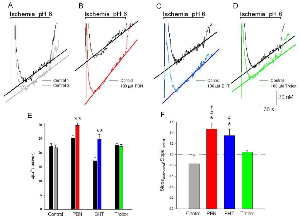 The rate of [Ca2+]i, increases in response to acidic ischemia are potentiated by PBN and BHT. Expanded, representative traces of the second phase of [Ca2+]i, increases as a function of time during a (A) 2 min application of glucose-free PSS pH 6.0 with 4 mM NaN3 (black trace). Following a 20 min washout, a second application of acidic ischemia induces an approximately equal rate of [Ca2+]i increase (grey trace); Straight lines are linear fits to the data. In separate experiments, following the control acidic ischemia application (black traces), cells were incubated for 20 min in (B) 100 μM PBN or (C) 100 μM BHT prior to a second acidic ischemia insult which produced rates of increase in [Ca2+]i greater than control values (red and blue traces, respectively). Incubation in 100 μM trolox (D) had no effect on the rate of increase in [Ca2+]i compared to control (green trace); (E) Summary of measurements of the slopes of [Ca2+]i increases from experiments identical to (A–D) expressed as means ± S.E.M.. Black bars represent slopes measured from initial control responses and color bars represent slopes from subsequent responses in the absence (gray) and presence of the antioxidants. ** p < 0.001, compared to control by student t-test; (F) Slopes measured from second responses to acidic ischemia recorded in the absence and presence of the three antioxidants were normalized to slopes measured from initial control responses and expressed as means ± S.E.M. One way ANOVA comparison was performed on ratios of test responses/control responses. * p < 0.5 compared to control, # p < 0.5 compared to trolox, † p < 0.5 compared to BHT. Number of cells measured; Control, n = 272; PBN, n = 106; BHT, n = 178; Trolox, n = 131.