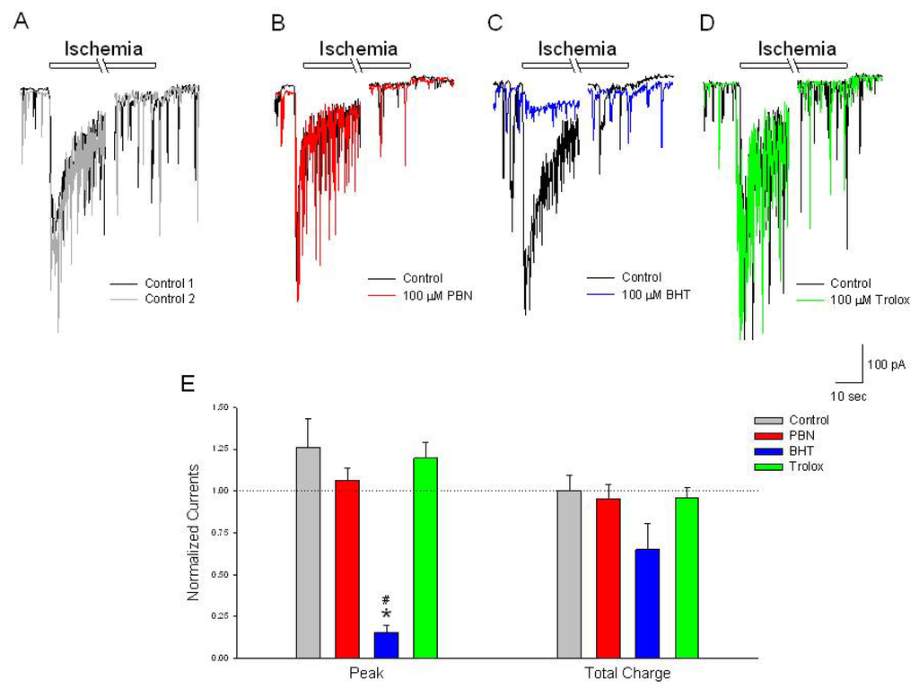 BHT inhibits the initial peak inward current activated by ischemia. (A–D) Representative traces of inward currents recorded from cultured rat cortical neurons voltage clamped at −70 mV in the perforated-patch whole-cell configuration. Control recordings (black and grey traces) demonstrate a rapid activating, slow inactivating current induced by a 2 min application of NaN3 in the absence of glucose. In separate experiments, following the control ischemic responses (black traces), a 20 min incubation in (B) 100 μM PBN (red trace) or (D) 100 μM trolox (green trace) had no effects on the ischemia activated current; (C) 100 μM BHT, however, inhibited the initial peak inward current (blue trace); (E) Summarizing experiments identical to (A–D), second responses recorded in the absence and presence of the three antioxidants were normalized to initial control responses and expressed as means ± S.E.M. Peak, initial inward current relative to baseline; Total Charge, integration of inward current from beginning of acidic ischemia event to end of record. One way ANOVA comparison was performed on ratios of test responses/control responses. * p < 0.5 compared to control, # p < 0.5 compared to trolox. Number of cells measured; Control, n = 6; PBN, n = 7; BHT, n = 6; Trolox, n = 5.