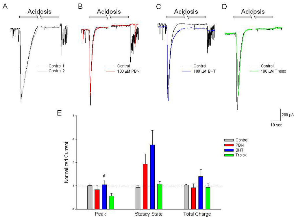 Antioxidants have no effect on acidosis-activated inward currents compared to control. (A–D) Representative traces of inward currents recorded from cultured rat cortical neurons voltage clamped at −70 mV in the perforated-patch whole-cell configuration. Control recordings (black and grey traces) demonstrate a rapid activating, inactivating current along with a sustained outward current, induced by a 2 min change in external pH from 7.4 to 6.0. In separate experiments, following the control acidosis responses (black traces); a 20 min incubation in (B) 100 μM PBN (red trace); (C) 100 μM BHT (blue trace) or (D) 100 μM trolox (green trace) had no effects on the acidosis activated currents; (E) Summarizing experiments identical to (A–D), second responses recorded in the absence and presence of the three antioxidants were normalized to initial control responses and expressed as means ± S.E.M. Peak, initial inward current relative to baseline; Steady State, current measured at end of acidic episode relative to baseline; Total Charge, integration of inward current from beginning of acidic ischemia event to end of record. One way ANOVA comparison was performed on ratios of test responses/control responses. # p < 0.5 compared to trolox. Number of cells measured; Control, n = 6; PBN, n = 5; BHT, n = 6; Trolox, n = 5.