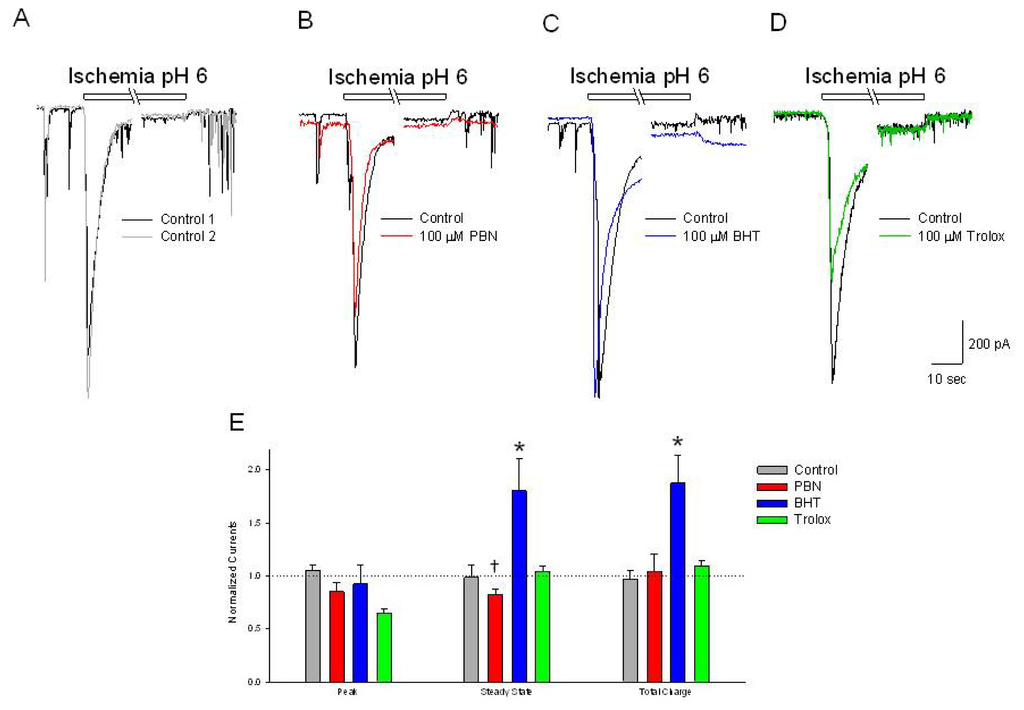 Acidic ischemia activates inward currents in cells voltage clamped at −70 mV, characterized by a large initial transient (−1201 ± 179 pA), which rapidly inactivates to baseline (−28 ± 31 pA) (Figure 7A). Activation of this current was reproducible following a 20 min washout (−1366 ± 186 and −45 ± 54 pA, respectively). Incubation in 100 μM PBN or 100 μM BHT for 20 min had no effect on the initial transient current (Figure 7B–E). BHT, however, potentiated the inward steady state current by 80% (Figure 7E). Incubation in 100 μM trolox produced a 35% reduction in the initial inward current, which was not statistically different from control when compared to all the treatments using a one-way ANOVA, but was statistically different from control when compared with a student t-test (p < 0.001) (Figure 7E).