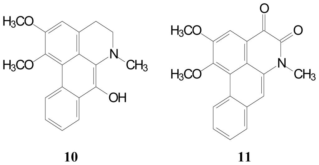 Nelumbo nucifera Gaertn. cv. Rosa-plena is a perennial aquatic crop grown and widely distributed throughout Asia, and long used for food and medicine. All segments of N. nucifera have been used for various medicinal purposes in traditional oriental medicine. The matured leaf is fibrous and usually used as a health food in Asia. The leaves are famous for their astringent properties and use as diuretics, and are also used to treat sweating, fever, strangury and as a styptic [1]. To further understand the chemotaxonomy of the Nelumbo species [1], Nelumbo nucifera Gaertn. cv. Rosa-plena was chosen for phytochemical investigation and evaluated for bioactive compounds (Figure 1). We are not aware of any publications concerning the chemical components of this plant against parasites such as Anisakis simplex and Hymenolepis nana. The compounds derived from the leaves of Nelumbo nucifera Gaertn. cv. Rosa-plena include eleven aporphines: liriodenine (1), lysicamine (2), (-)-anonaine (3), (-)-asimilobine (4), (-)-caaverine (5), (-)-N-methylasimilobine (6), (-)-nuciferine (7), (-)-nornuciferine (8), (-)-roemerine (9), 7-hydroxydehydronuciferine (10) and cepharadione B (11) [1–3] (Figure 2).