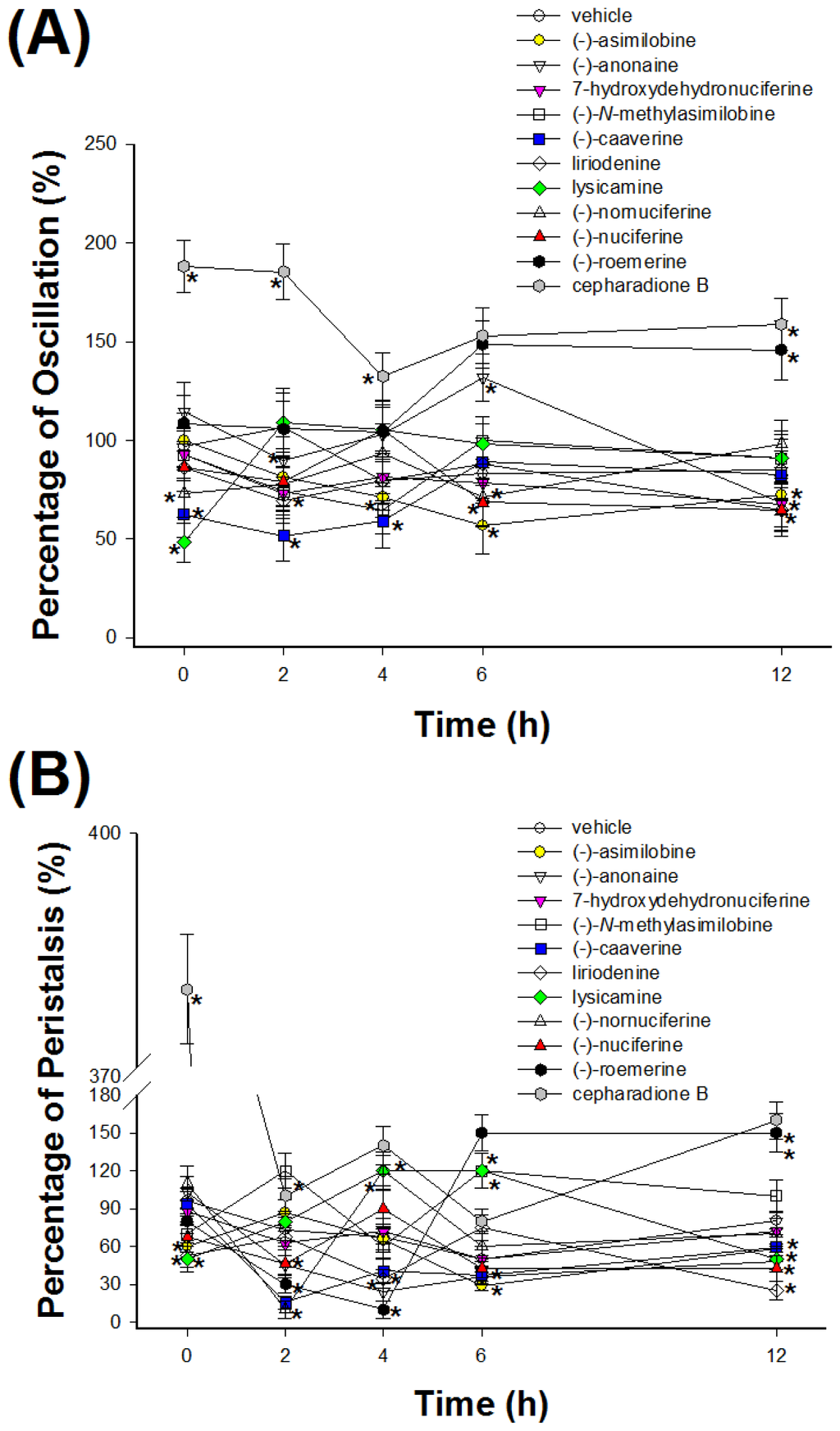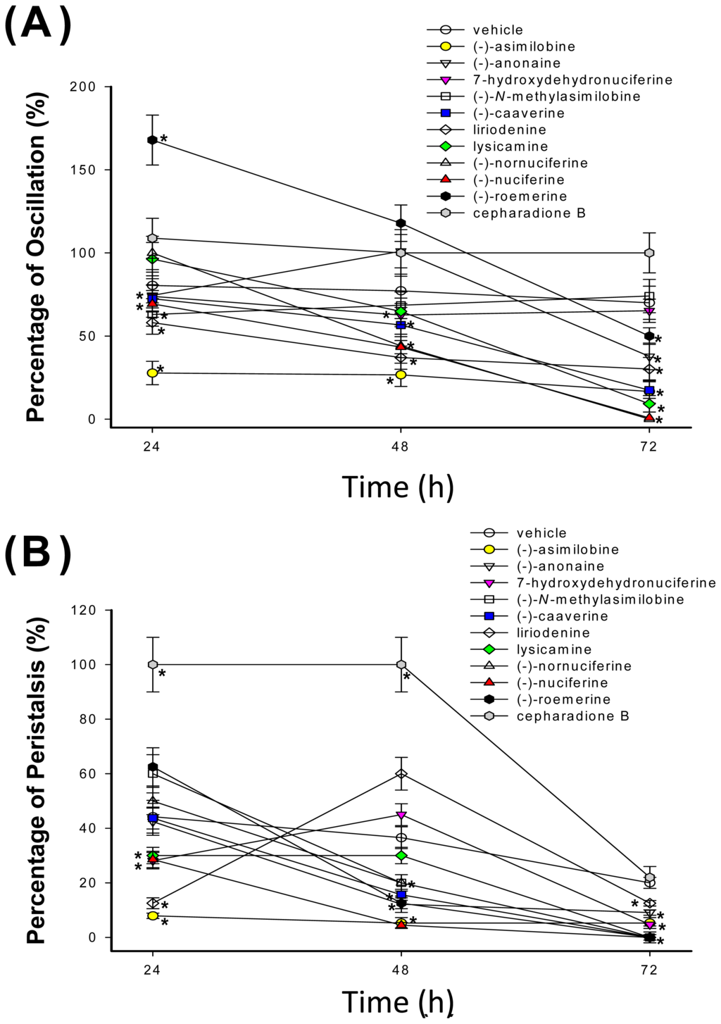 Figure 4a,b plot the time course of oscillation and peristalsis during liriodenine (1), lysicamine (2), (-)-anonaine (3), (-)-asimilobine (4), (-)-caaverine (5), (-)-N-methylasimilobine (6), (-)-nuciferine (7), (-)-nornuciferine (8), (-)-roemerine (9), 7-hydroxydehydronuciferine (10) and cepharadione B (11) treatment of 24, 48 and 72 h. In oscillation and peristalsis activity assay, vehicle control (0.1% DMSO) was decreased to 70% and 20%, respectively from 24 to 72 h cultivation (Figure 4a,b).
