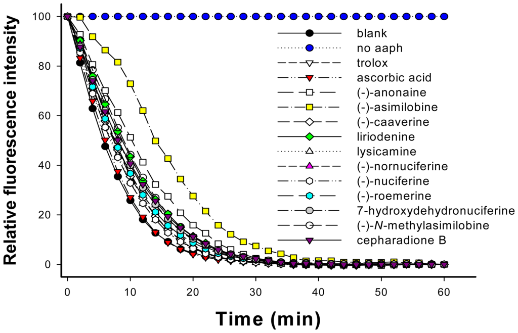 Time course of changes in fluorescence decay curve of fluorescein in the presence of 1 μM Trolox, ascorbic acid, liriodenine (1), lysicamine (2), (-)-anonaine (3), (-)-asimilobine (4), (-)-caaverine (5), (-)-N-methylasimilobine (6), (-)-nuciferine (7), (-)-nornuciferine (8), (-)-roemerine (9), 7-hydroxydehydronuciferine (10) and cepharadione B (11), respectively. For calculation of the area under the curve (AUC), please see Equation (2) in Section 3.7.