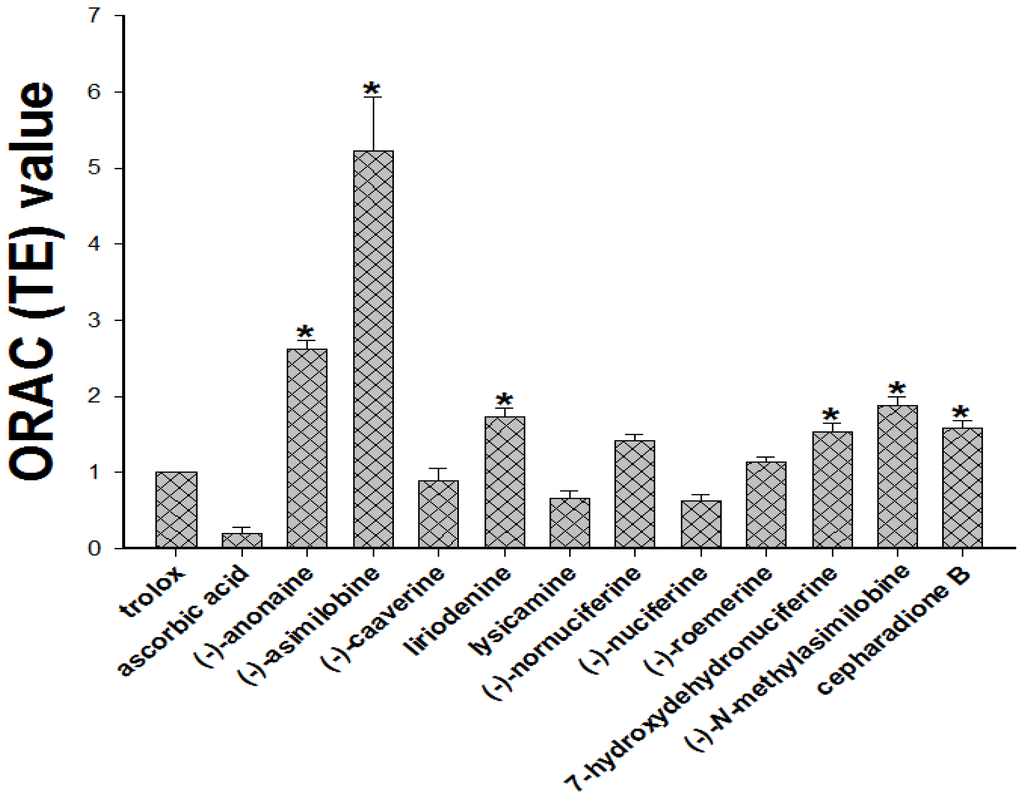 When the test compounds were added, the relative fluorescence intensity decreased. Fluorescein was exposed to excitation light at 495 nm in the absence of AAPH over a 60-min period. There were no significant changes in fluorescence intensity over 60 min, suggesting that 0.06 μM fluorescein is photostable under such conditions. As shown in Figure 6, at a concentration of 1.0 μM, the average ORAC values of Trolox, ascorbic acid, liriodenine (1), lysicamine (2), (-)-anonaine (3), (-)-asimilobine (4), (-)-caaverine (5), (-)-N-methylasimilobine (6), (-)-nuciferine (7), (-)-nornuciferine (8), (-)-roemerine (9), 7-hydroxydehydronuciferine (10) and cepharadione B (11) for relative Trolox equivalents (TE) ORAC were determined to be 1.00, 0.20, 1.73, 0.67, 2.62, 5.23, 0.89, 1.89, 0.63, 1.43, 1.14, 1.54 and 1.59, respectively (Figure 6). The order of the ORAC values of the compounds was: (-)-asimilobine > (-)-anonaine > (-)-N-methylasimilobine > liriodenine > cepharadione B ≥ 7-hydroxydehydronuciferine > (-)-nornuciferine > (-)-roemerine > Trolox > (-)-caaverine > lysicamine ≥ (-)-nuciferine > ascorbic acid.