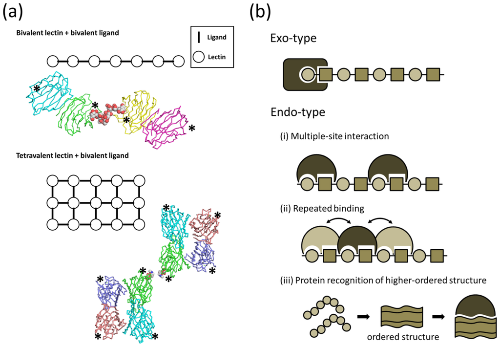 (a) Schematic representations of bivalent lectin-bivalent ligand (type I) and tetravalent lectin-bivalent ligand (type II) complexes. Crystal packings are shown for bivalent galectin-1 dimer in complex with biantennary complex-type glycan (type I, upper panel, PDB code 1SLB), and tetravalent soybean agglutinin tetramer in complex with binantennary complex-type glycan (type II, lower panel, PDB code 1SBE). Protein and carbohydrate molecules are shown in wire and sphere models, respectively, and arbohydrate binding sites are shown with asterisks; (b) Schematic representations of exo-type (upper) and endo-type (lower) interactions. The affinity enhancement strategies of endo-type lectins: (i) multiple-site interaction; (ii) repeated binding; and (iii) protein recognition of ordered/higher-ordered polysaccharide structures.