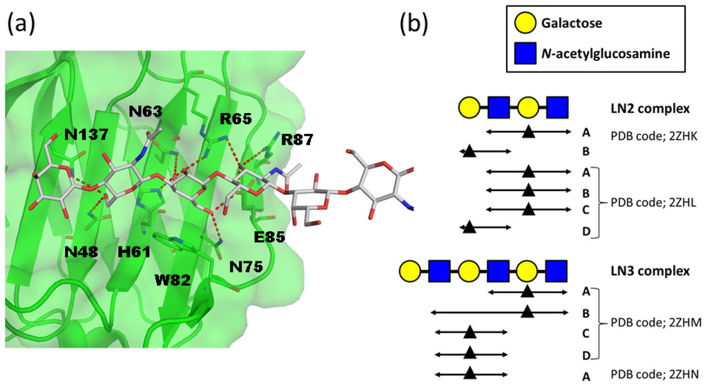 Polylactosamine recognition by galectins. (a) Structure of human galectin-9 N-terminal carbohydrate recognition domain (NCRD)–LacNAc trimers (LN3) complex (PDB code 2ZHN). The protein molecule is shown in semi-transparent surface and ribbon models. The amino-acid residues that interact with carbohydrate residues are shown in rod models. Hydrogen bonds are indicated by red dotted lines; (b) Schematic representation of the interaction modes of LN2 and LN3 complexes. Galactose residues that interact with conserved key residues in galectin-9 NCRD are shown as black triangles. Carbohydrate residues that interact with galectin-9 NCRD are indicated by double head arrows.