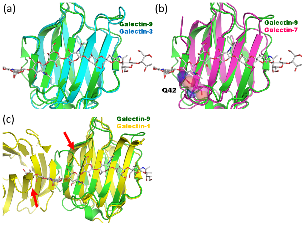Structural comparison of galectin CRDs. (a) Structural superpositions between hypothetical galectin-9 NCRD-LN5 complex (green) and human galectin-3 CRD (cyan; PDB code 1A3K) [17]; (b) Structural comparison with human galectin-7 CRD (magenta; PDB code 1BKZ) [18]. The Gln42 side chain, which collides with LN5, is shown in rod model; (c) Structural comparison with human dimeric galectin-1 CRD (yellow; PDB code 3OYW) [23]. Possible steric clashes are indicated with red arrows.