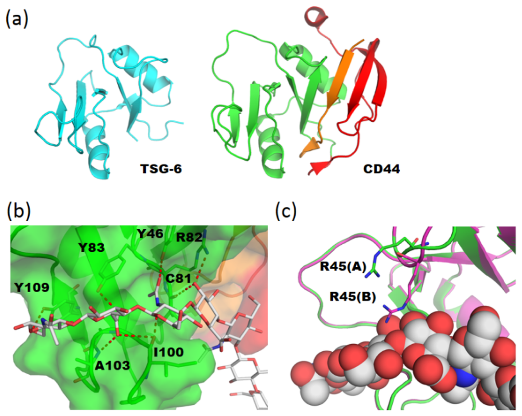 - Blundell, C.D.; Mahoney, D.J.; Almond, A.; DeAngelis, P.L.; Kahmann, J.D.; Teriete, P.; Pickford, A.R.; Campbell, I.D.; Day, A.J. The link module from ovulation- and inflammationassociated protein TSG-6 changes conformation on hyaluronan binding. J. Biol. Chem. 2003, 278, 49261–49270. [Google Scholar]