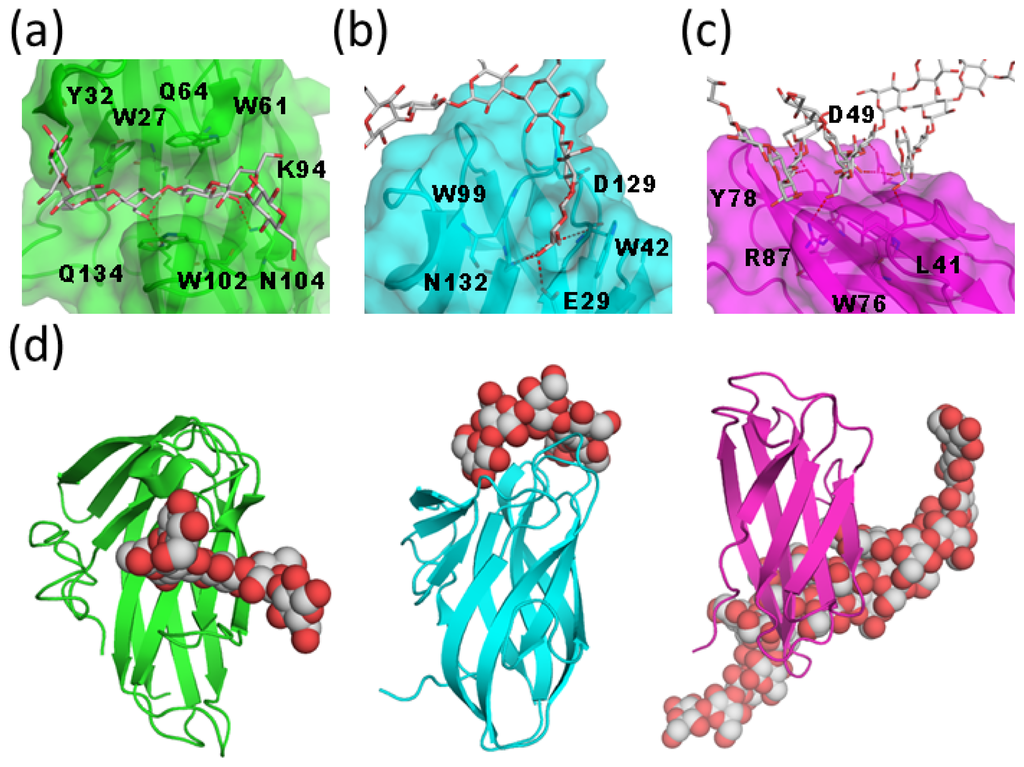 Interaction between cellulose-binding module (CBM) and β1–3 glucan. (a) Close-up view of the ligand-binding site of TmCBM4-2 in complex with laminariheptaose (PDB code 1GUI) [39]. Protein molecule is shown in semi-transparent surface and ribbon models. Carbohydrate is shown in rod model; (b) Close-up view of the ligand-binding site of BhCBM6 in complex with laminarihexaose (PDB code 1W9W) [40]; (c) Close-up view of the ligand-binding site of βGRP-N in complex with laminarihexaose (PDB code 3AQX) [43]; Hydrogen bonds are indicated by red dotted lines; (d) Structural comparison of three CBMs, TmCBM4-2 (left), BhCBM6 (middle) and βGRP-N (right). Protein and carbohydrate are shown in ribbon and sphere models, respectively.