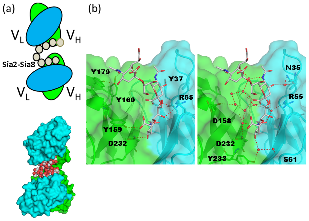Structural analysis of anti-polysialic acid antibody and oligosialic acid. (a) Schematic representation of a single-chain variable fragment of mAb735 (scFv735) in complex with octasialic acid is shown in the upper panel (PDB code 3WBD) [52]. Two proteins and one carbohydrate in the asymmetric unit are shown in the surface and sphere models, respectively (lower panel); (b) Close-up view of the carbohydrate-recognition site. Direct and water-mediated interactions between scFv735 and trisialic acid are shown in the left and right panels, respectively. Hydrogen bonds are shown as red dotted lines. Water molecules that bridge scFv735 and trisialic acid are shown as red spheres.