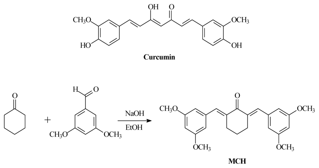 Chemical structure of curcumin and synthesis of (2E,6E)-2,6-bis(3,5-dimethoxybenzylidene)cyclohexanone (MCH).