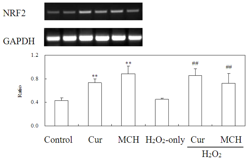 Curcumin does not only have the ability to scavenge free radicals, but most importantly, it can strongly induce the expression of many antioxidant genes in mammalian cells including the activation of the transcription factor NF-E2-related factor 2 (Nrf2), a master regulator of intracellar detoxifying systems [18]. To determine the effects of MCH on Nrf2 gene transcription, Nrf2 mRNA expression was analyzed by semi-quantitative RT-PCR (Figure 10). The mRNA expression of Nrf2 was significantly induced by the treatment with curcumin or MCH at 5 μM. After incubation of PC12 cells with 150 μM H2O2 for 24 h, higher expression level of Nrf2 gene was retained with the pretreatment of curcumin or MCH at 5 μM, which was approximately 1.9, 1.6 fold (versus H2O2-only treatment), respectively.