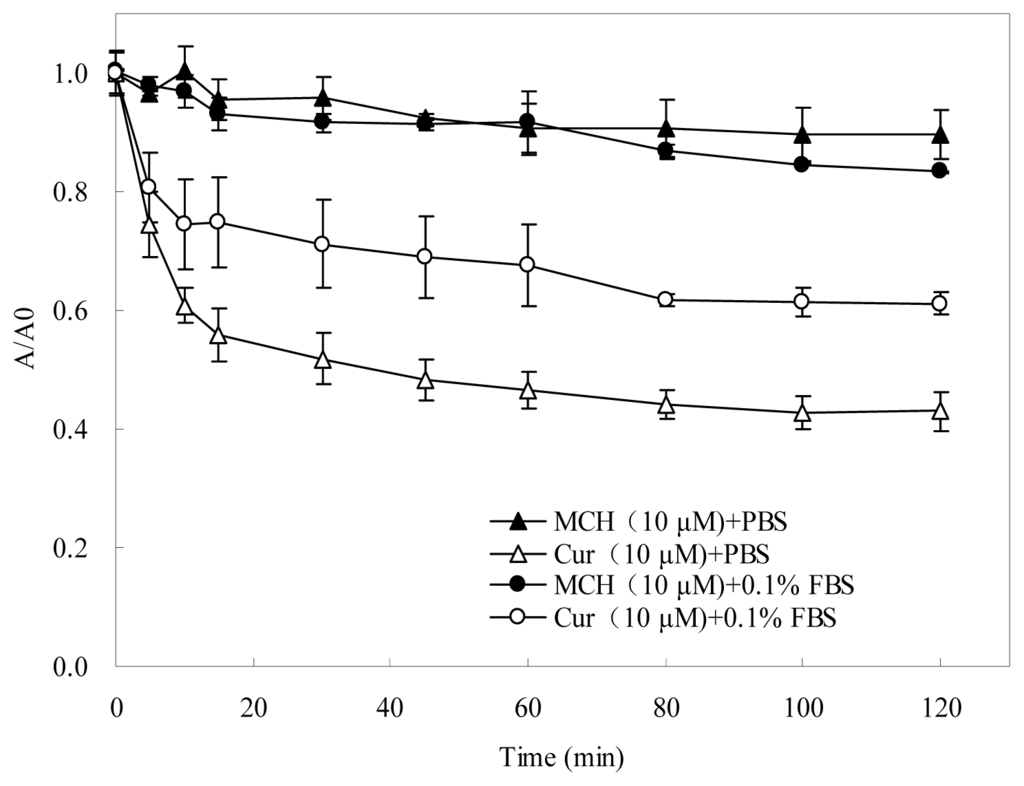 The stability of the tested compounds was measured according to the procedure of Fang et al. [33] with some modification. MCH and curcumin were dissolved in 100% DMSO at 5 mM for the measurement. When measurement began, 80 μL of the tested compound solution was diluted with 4 mL of 1.5 mM phosphate-buffered solution (pH 7.4). The degradation process was followed by visible absorption spectroscopy at 410 nm in a rectangular quartz cuvette with a 1 cm optical path length at 37 °C on a Shimadzu 2600 UV/visible spectrophotometer in the presence or absence of 0.1% FBS. The absorption of the solution measured at 0 min was recorded as A0; the absorption of the solution measured at other time was recorded as At. All results are representative of three independent experiments.