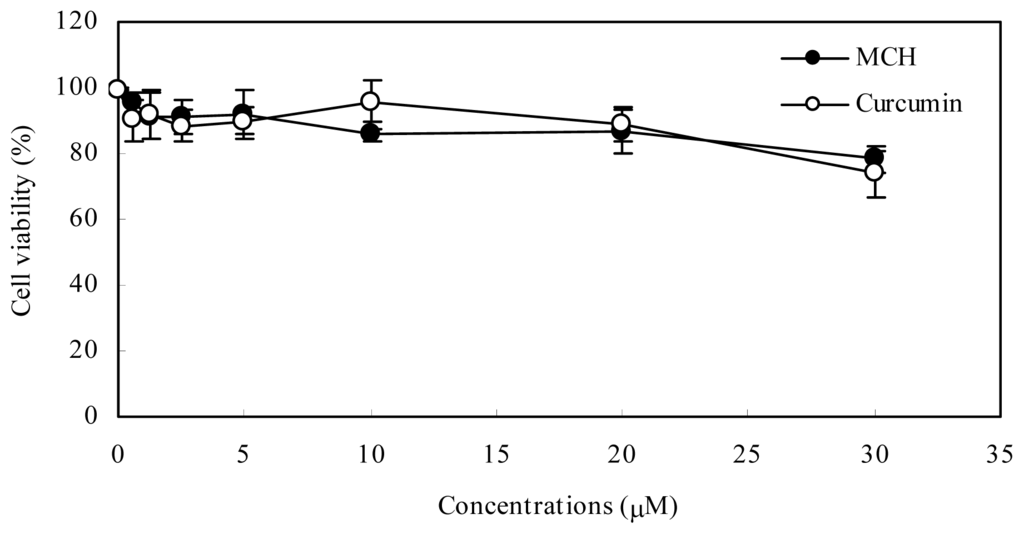 After 24 h treatment with MCH at concentrations between 0.63 and 5 μM, the reduction in cell viability was no greater than 9% (Figure 3). At the highest concentration (30 μM) evaluated, the reduction in cell viability was 21.8%. There is no significant difference in cytotoxicity induced by MCH and curcumin in PC12 cells.