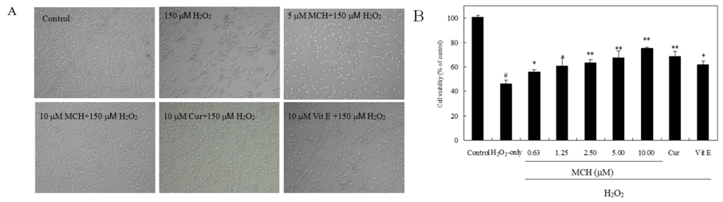 The protective effect of MCH on H2O2-induced damage in PC12 cells. (A) Cell morphology, Original magnification: ×100; (B) Cell viability was determined by the MTT reduction assay. Cells were pretreated with 0.63–10.00 μM MCH or 10.00 μM vitamin E (Vit E), 10.00 μM curcumin (Cur) for 30 min and then incubated in the presence of 150 μM H2O2 for 3 h. The control group was treated with 0.2% (v/v) DMSO under the same culture conditions. Data presented are the means ± SD of results from three independent experiments (# p < 0.01 versus control; * p < 0.05 and ** p < 0.01 versus H2O2-treated cells).
