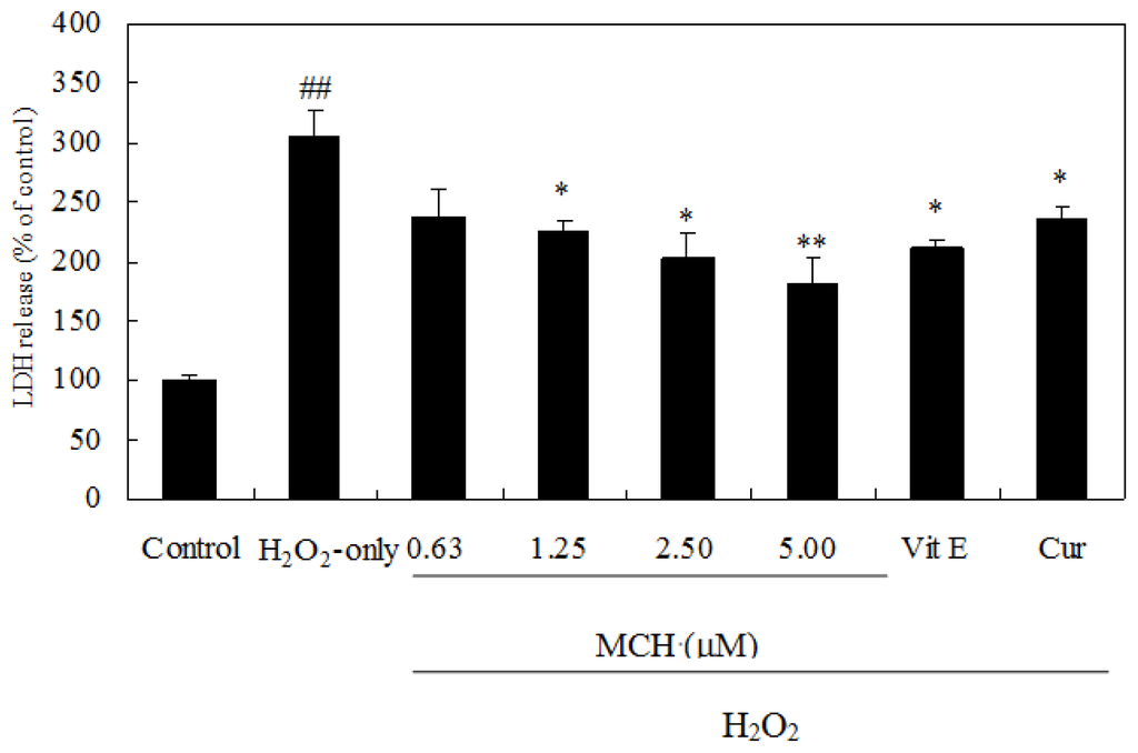 Inhibition of LDH release by MCH. Cells were pretreated with 0.63–5.00 μM MCH or 10.00 μM vitamin E (Vit E), 10 μM curcumin (Cur) for 30 min and then incubated in the presence of 150 μM H2O2 for 3 h. The control group was treated with 0.2% (v/v) DMSO under the same culture conditions. Data presented are the means ± SD of results from three independent experiments (## p < 0.01 versus control; * p < 0.05 and ** p < 0.01 versus H2O2-treated cells).