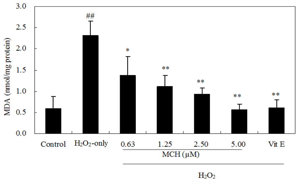 Effect of MCH on the MDA level in PC12 cells. Cells were pretreated with 0.63–5.00 μM MCH or 10 μM vitamin E (Vit E) for 30 min and then incubated in the presence of 150 μM H2O2 for 3 h. The control group was treated with 0.2% (v/v) DMSO under the same culture conditions. Data presented are the means ± SD of results from three independent experiments (## p < 0.01 versus control; * p < 0.05 and ** p < 0.01 versus H2O2-treated cells).
