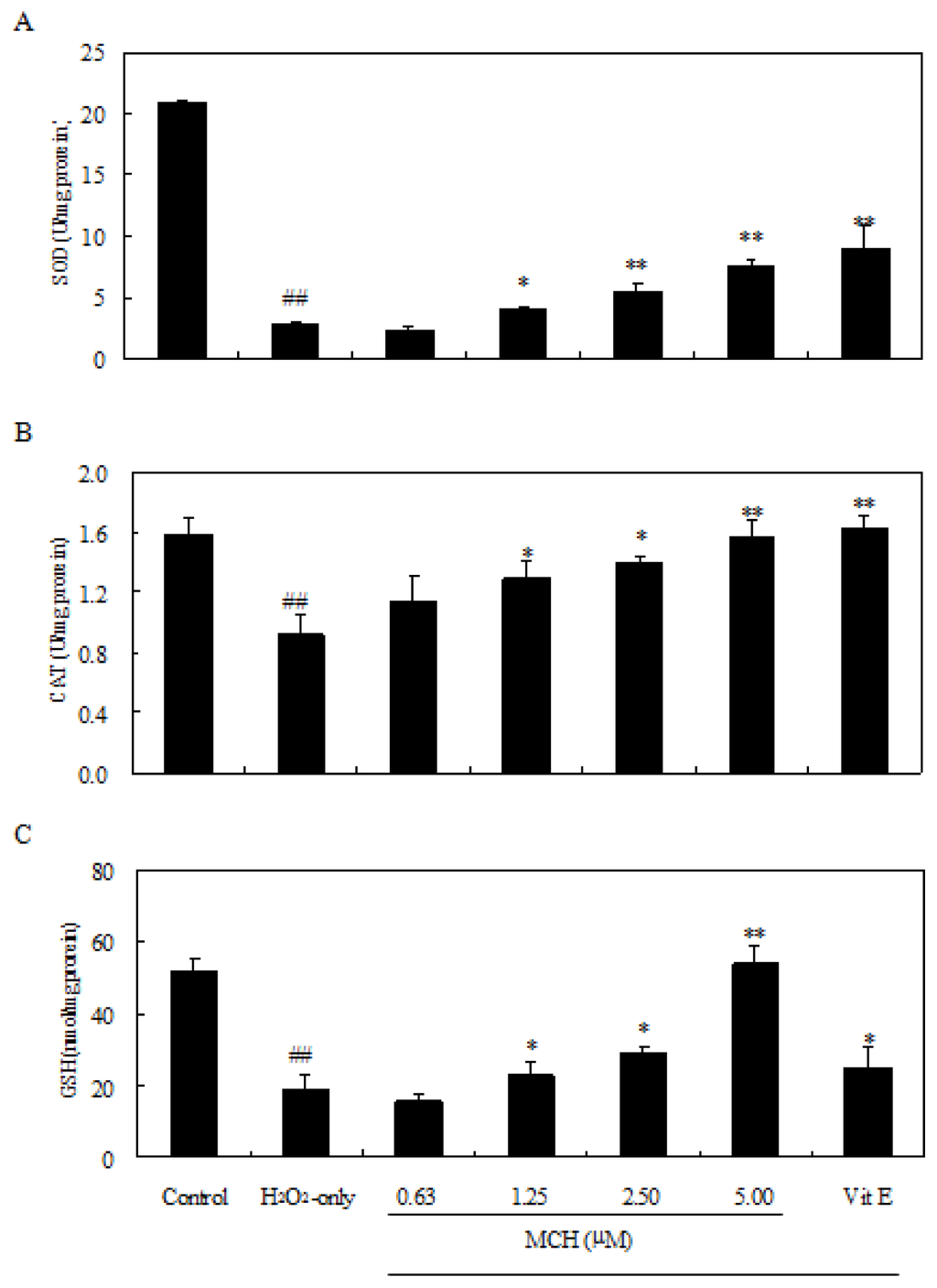 Effect of MCH on the activity of SOD (A); CAT (B) and intracellular GSH level (C) in PC12 cells. Cells were pretreated with 0.63–5.00 μM MCH or 10.00 μM vitamin E (Vit E) for 30 min and then incubated in the presence of 150 μM H2O2 for 3 h. The control group was treated with 0.2% (v/v) DMSO under the same culture conditions. Data presented are the means ± SD of results from three independent experiments (## p < 0.01 versus control; * p < 0.05 and ** p < 0.01 versus H2O2-treated cells).