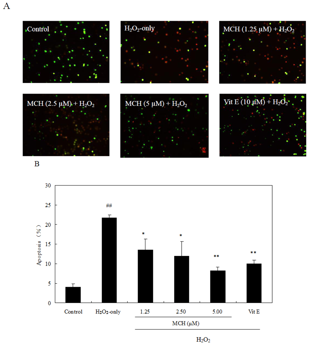 Inhibitory effect of MCH on H2O2-induced apoptosis in PC12 cells. (A) Morphological assessment by acridine orange-ethidium bromide (AO/EB) staining under the microscope (×100); (B) AV-FITC/PI analysis by flow cytometry method showed the percentage of apoptotic cells. Cells were pretreated with 0.63–5.00 μM MCH or 10.00 μM vitamin E (Vit E) for 30 min and then incubated in the presence of 150 μM H2O2 for 3 h. The control group was treated with 0.2% (v/v) DMSO under the same culture conditions. Data presented are the means ± SD of results from three independent experiments (## p < 0.01 versus control; * p < 0.05 and ** p < 0.01 versus H2O2-treated cells).