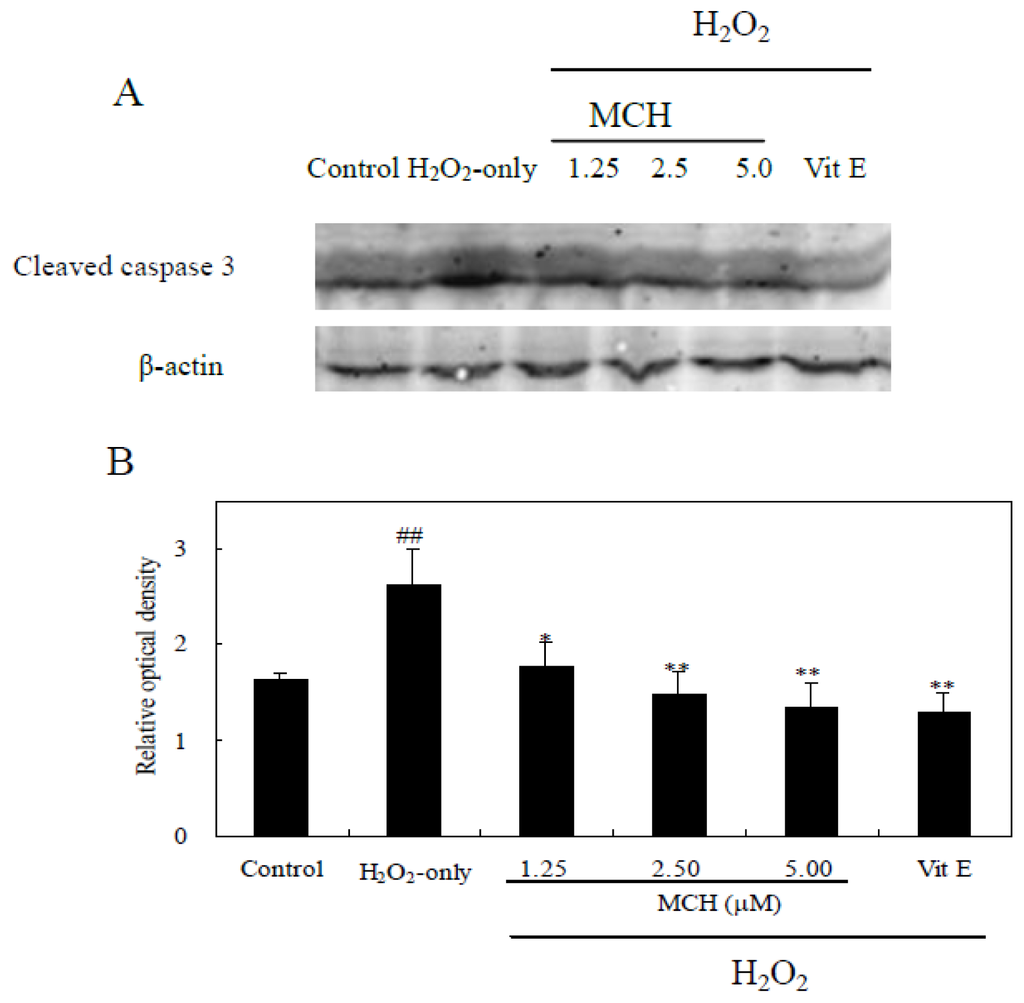 Effect of MCH on the expression of cleaved caspase-3 levels in PC12 cells. Cells were pretreated with MCH at 1.25–5.00 μM or 10.00 μM vitamin E (Vit E) for 30 min and then incubated in the presence of 150 μM H2O2 for 3 h. The control group was treated with 0.2% (v/v) DMSO under the same culture conditions. (A) The expression of cleaved caspase-3. β-actin was used for normalization and verification of protein loading; (B) Quantitative cleaved caspase-3 expression after normalization to β-actin. Data presented are the means ± SD of results from three independent experiments (## p < 0.01 versus control; * p < 0.05 and ** p < 0.01 versus H2O2-treated cells).