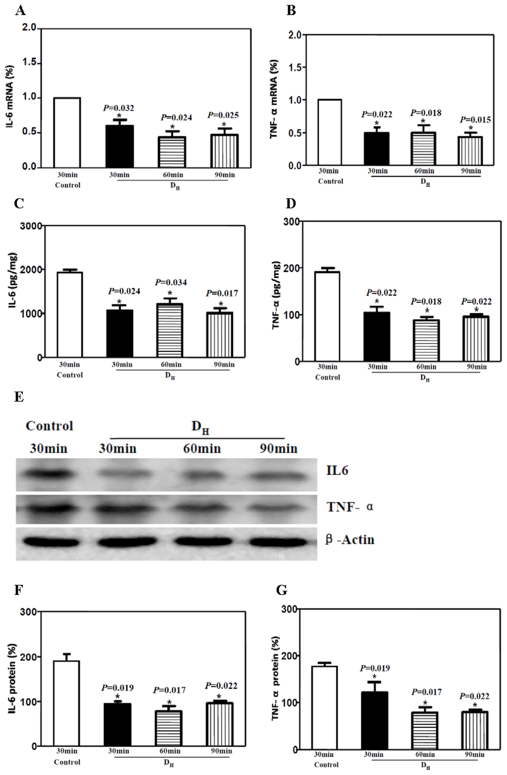 Rats were anesthetized and injected perineurally with either a high dose of dexmedetomidine (DH, 20 μg/kg) or normal saline (C). Sciatic nerves were harvested 30, 60 and 90 min after injection. Real-time PCR revealed that dexmedetomidine reduced the mRNA levels of both IL-6 and TNF-α at all of the examined time points (Figure 1A,B). The protein levels of both IL-6 and TNF-α were significantly decreased after perineural injection of dexmedetomidine at all time points, as shown by both ELISA (Figure 1C,D) and Western blotting (Figure 1E–G). These results suggested that perineural injection of 20 μg/kg dexmedetomidine reduces the sciatic nerve levels of IL-6 and TNF-α at the level of both mRNA and protein.