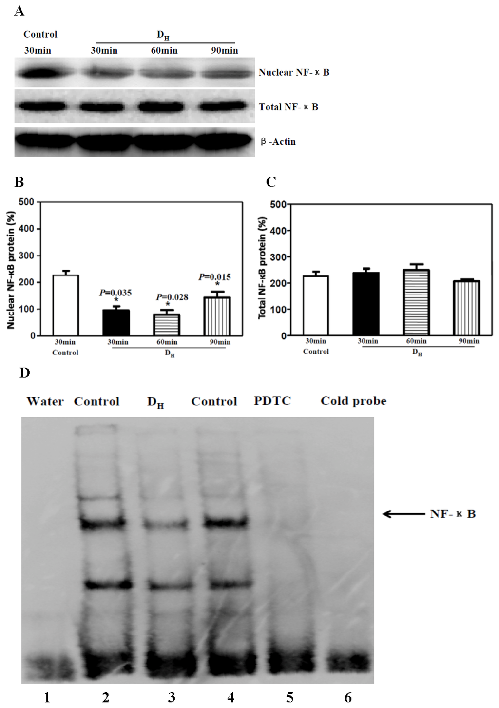 Perineural administration of 20 μg/kg dexmedetomidine decreased the translocation to the nucleus and transcriptional binding activity of NF-κB. (A) Western blot showed that 20 μg/kg dexmedetomidine decreased NF-κB translocation into the nucleus; (B) Dexmedetomidine (20 μg/kg) decreased the nuclear NF-κB protein level; (C) Dexmedetomidine (20 μg/kg) did not alter the total NF-κB protein level; (D) EMSA showed that 20 μg/kg dexmedetomidine decreased the transcriptional binding activity of NF-κB (lane 3); PDTC also decreased NF-κB transcriptional binding activity (lane 5). NF-κB, nuclear factor-kappa B; PDTC, pyrrolidine dithiocarbamate.