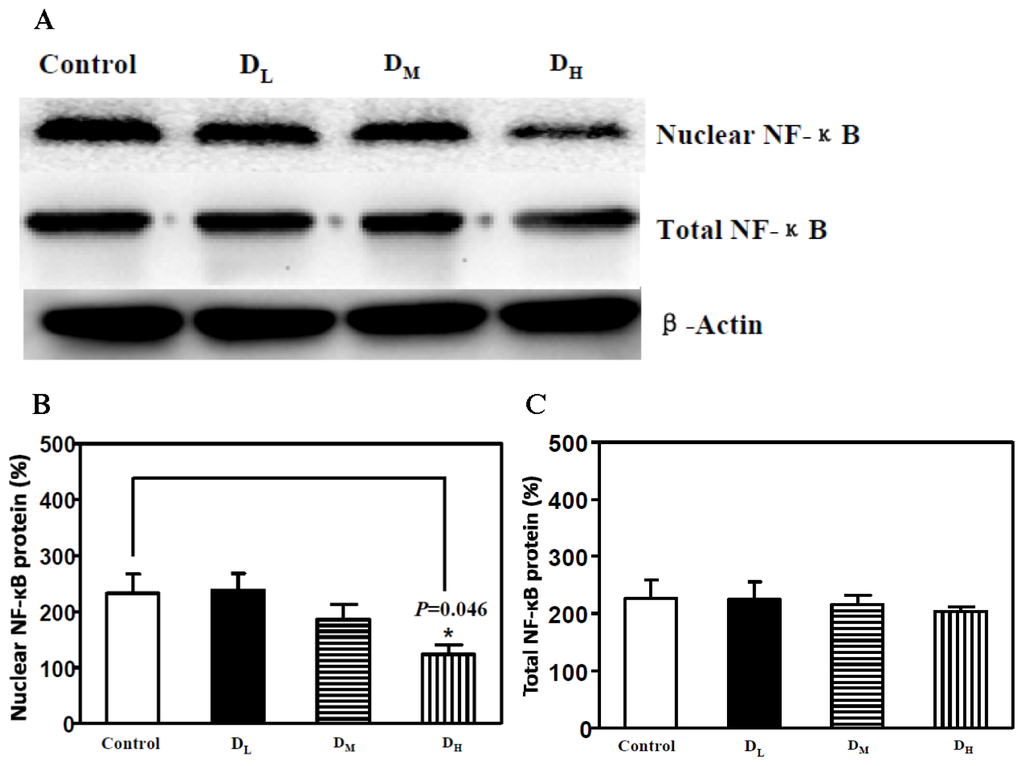An electrophoretic-mobility shift assay (EMSA) kit (GS-0030, Signosis, Santa Clara, CA, USA) was used to assess the transcriptional binding activity of NF-κB as a previous study described [11]. The nuclear extract (5 mg) was incubated with 1 μL poly d(I-C), 2.0 μL 5× Binding Buffer and 1.0 μL of transcription factor (TF) probe in a 0.5 mL microcentrifuge tube at 20–23 °C for 30 min in a PCR machine. We added 1.0 μL of cold TF probe into this reaction for the cold probe control. Samples were then loaded onto a 6.5% non-denaturing polyacrylamide gel and separated at 100 V, and the proteins were transferred to a membrane at 60 V for 1 h at 4 °C. The membrane was imaged using a chemiluminescence imaging system (Bio-Rad, Hercules, CA, USA).