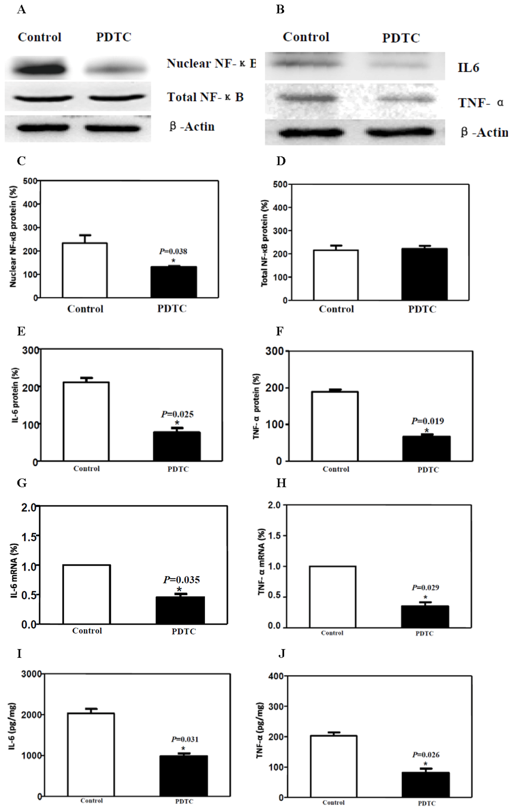 PDTC attenuated the inflammation of the sciatic nerve via the NF-κB pathway. (A,C,D) Western blotting showed that PDTC decreased NF-κB translocation into the nucleus; (B,E,F) Western blotting showed that PDTC reduced the IL-6 and TNF-α protein levels in the sciatic nerve; (G,H) RT-PCR showed that PDTC reduced the IL-6 and TNF-α mRNA levels in the sciatic nerve; (I,J) ELISA showed that PDTC reduced the IL-6 and TNF-α protein level in the sciatic nerve.