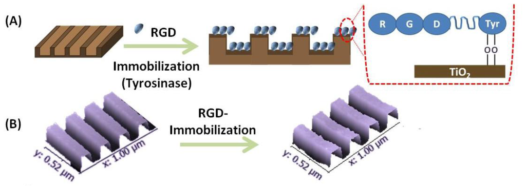 3.1. Immobilization of RGD on TiO2 Nanopatterned Substrates