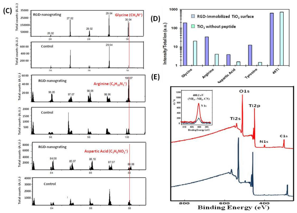 (A) Schematic showing the attachment of RGD on TiO2 nanogratings; (B) 3-D AFM images showing retention of the TiO2 nanopatterns after RGD immobilization; (C) Time-of-Flight Secondary Ion Mass Spectrometry (ToF-SIMS) confirmed the attachment of RDG peptide on the TiO2 surface. The specific fragment pattern generated by removal of individual amino acids from peptide is shown in the lower panels. (Glycine m/z 30.04 u:CH4N+, Arginine m/z 100.07 u:C4H10N+, Aspartic acid m/z 88.08 u:C3H6NO2+); (D) Typical peak ratio of amino acids normalized by total ions; (E) XPS spectra; wide scan of N1s spectra of TiO2 surfaces before and after the immobilization of peptide. Inset: a high-resolution scan of N1s.