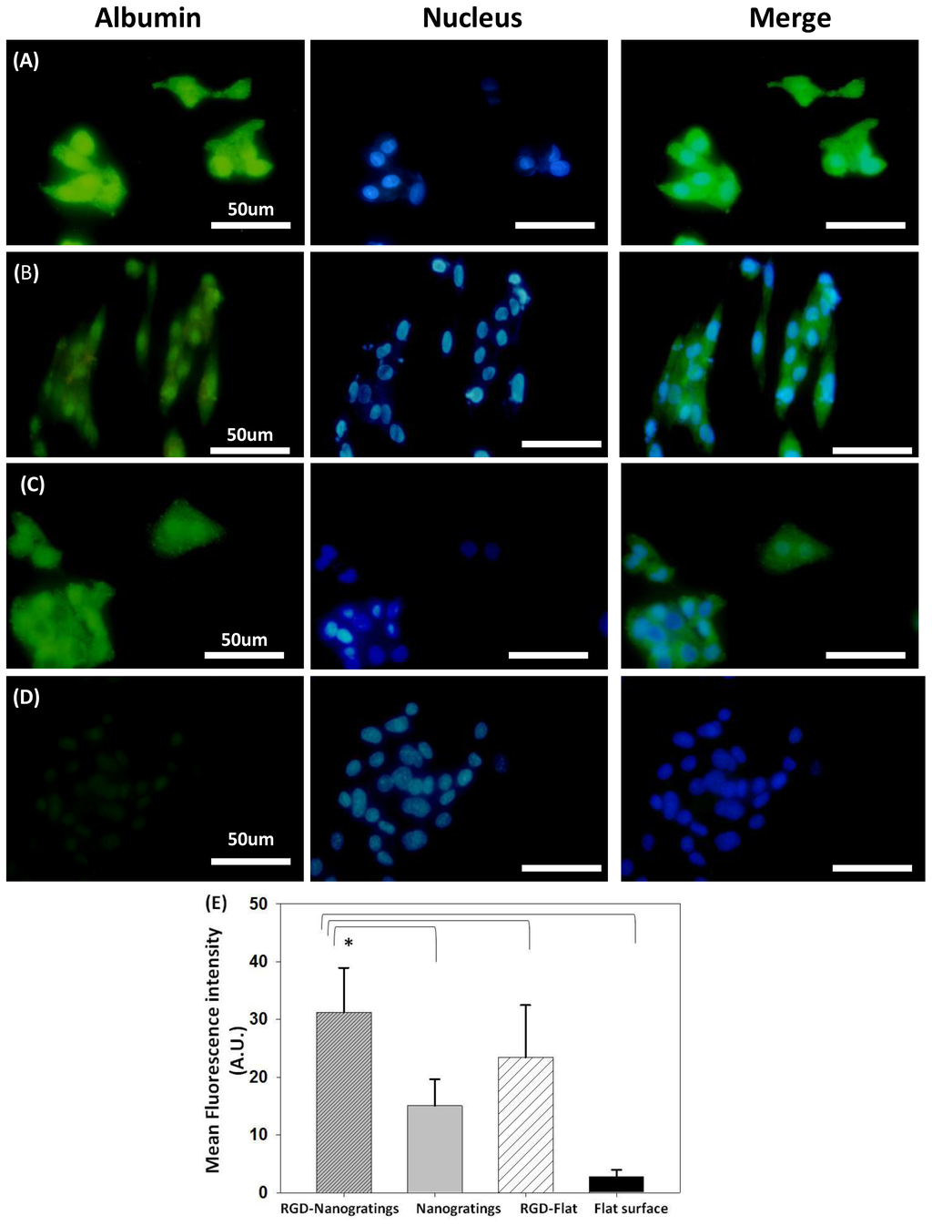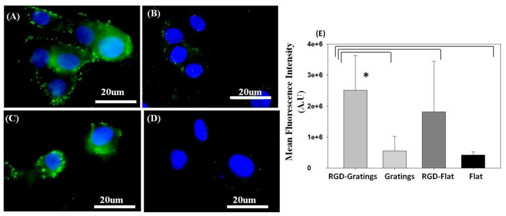 Immunofluorescence staining of the hepatic functional protein, albumin (green excitation λ = 448 nm), in HepG2 cells cultured on (A) RGD TiO2-nanograting pattern; and (B) TiO2-nanograting pattern alone; and (C) RGD-flat surface compared to cells cultured on (D) Flat surface alone (control); (E) Relative mean fluorescence intensity calculated using Image J for HepG2 cultured on biofunctionalized TiO2 substrates * Statistical significance at (p < 0.05).