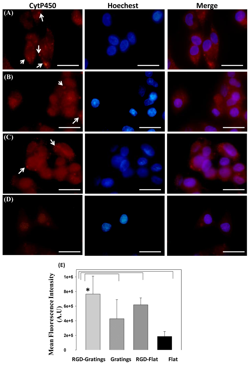Immunofluorescence staining of the hepatic protein, cytochrome P-450 2C9 (red excitation λ = 578 nm), in HepG2 cells cultured on (A) RGD TiO2-nanograting pattern; and (B) TiO2-nanograting pattern; (C) RGD-flat surface compared to cells cultured on (C) and (D) control, arrow heads indicate the fluorescent red dots of cytochrome P-450; (E) Relative mean fluorescence intensity calculated using ImageJ for HepG2 cultured on biofunctionalized TiO2 substrates. * Statistical significance at (p < 0.05).