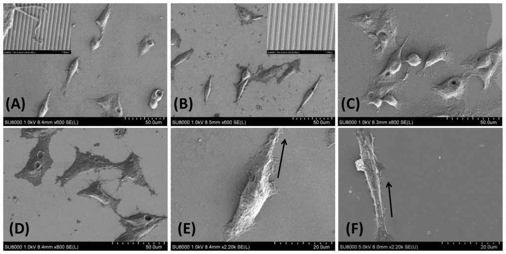 SEM images of HepG2 cells cultured for 12 hrs in (A) RGD-TiO2 nanogratings compared to (B) TiO2 nanopattern alone and (C) RGD-TiO2 flat surface (D) flat surface alone (Control), insets are higher magnification SEM images that show the direction of nanogratings and the cell alignments parallel to TiO2 lines. Furthermore, the increase in cell width where indicated in (E) RGD-TiO2 and (F) nanogratings alone while black arrow indicate the direction of nanogratings.