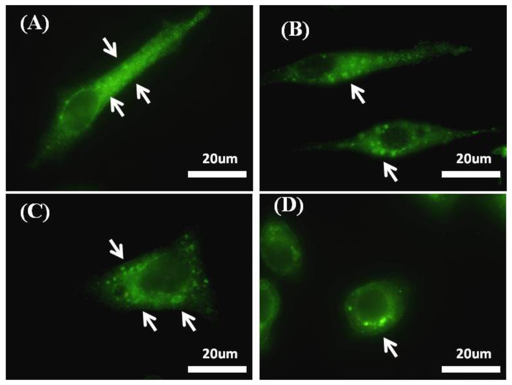 An increase in integrin β1 clusters that mediate focal adhesion formation using immunostaining of integrin B1 by Alexa-fluor 488 linked-AB (excitation λ = 488 nm) of HepG2 cells cultured on RGD-TiO2 substrates on which (A) RGD-nanogratings show high integrin β1 clusters while (B) Nanogratings alone show low integrin B1 clustering compared to it, on the other hand (C) RGD-flat surface shows high integrin β1 clusters, mean while (D) flat substrate alone (control) has the lowest integrin clustering; arrow heads show clusters of integrin B1 as green fluorescent dots.