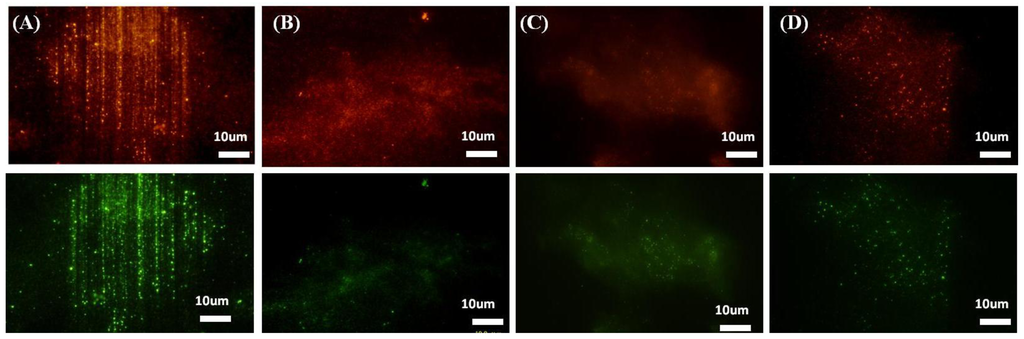 ECM components assembled by HepG2 cells cultured for 66 h on TiO2 substrates. (A) RGD-nanogratings; (B) nanogratings alone and compared to (C) RGD-flat surface and (D) flat substrate or control alone. Red fluorescence represents collagen IV Ab (2ry-Alexa fluor-540), green fluorescence represents fibronectin (2ry Ab Alexa-fluor-488) after decellularization using H2O for 1 h at 37 °C.