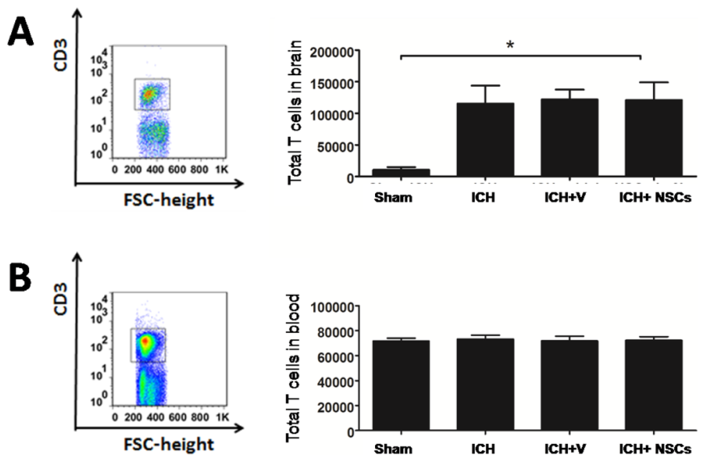 Total numbers of T lymphocyte cells in the brain and peripheral blood. Total numbers of T lymphocytes in the brain were significantly increased in intracerebral hemorrhage (ICH), vehicle-treated (ICH + V) and neural stem cells (NSCs)-treated groups (ICH + NSCs), compared to sham-operated group (Sham) (A); there was no difference of total numbers of T lymphocytes of each group in peripheral blood in ICH, vehicle-treated (ICH + V) and NSCs-treated groups (ICH + NSCs), compared to sham-operated group (Sham) (B), (n = 8 in each group). * p < 0.05 versus sham ICH.