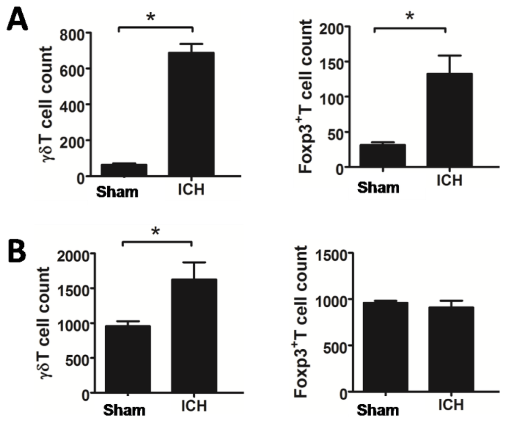 Increased absolute numbers of γδT and Treg cells in the brain and peripheral blood after ICH. The absolute numbers of γδT and Treg cells were increased significantly in the brain (A) and peripheral blood; (B) after ICH. (n = 8 in each group) * p < 0.05 versus sham ICH.
