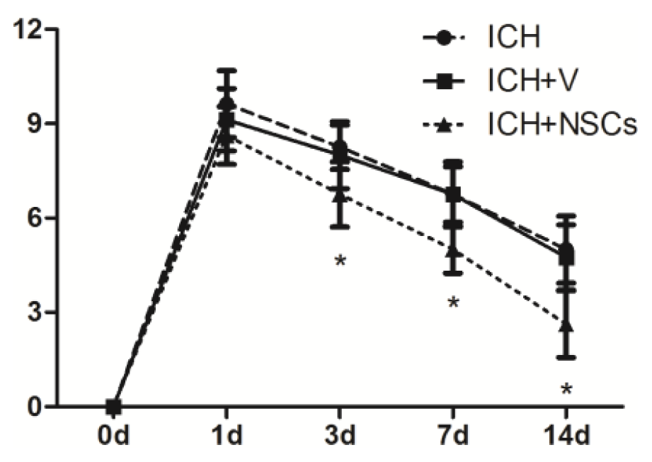 For rats treated with NSCs at day 1 after ICH, no significant difference in functional recovery was found. However, transplanted NSCs improve neurological function recovery at day 3, 7 and 14 compared with ICH and ICH-vehicle groups (Figure 3).