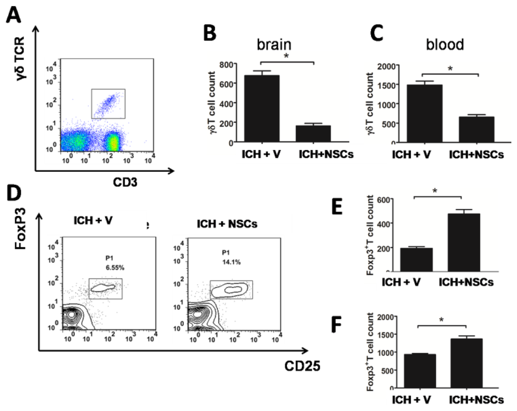 Transplanted NSCs altered γδT and Treg cells in the brain and peripheral blood. Transplanted NSCs reduced the absolute numbers of γδT cells in the brain and peripheral blood (A–C); The percentage and the absolute numbers of Treg cells were significantly increased in the brain by transplantation of NSCs (D,E); An increased absolute Treg cell numbers in the peripheral blood after transplanted NSCs (F). (n = 8 in each group) * p < 0.05 versus ICH-vehicle.