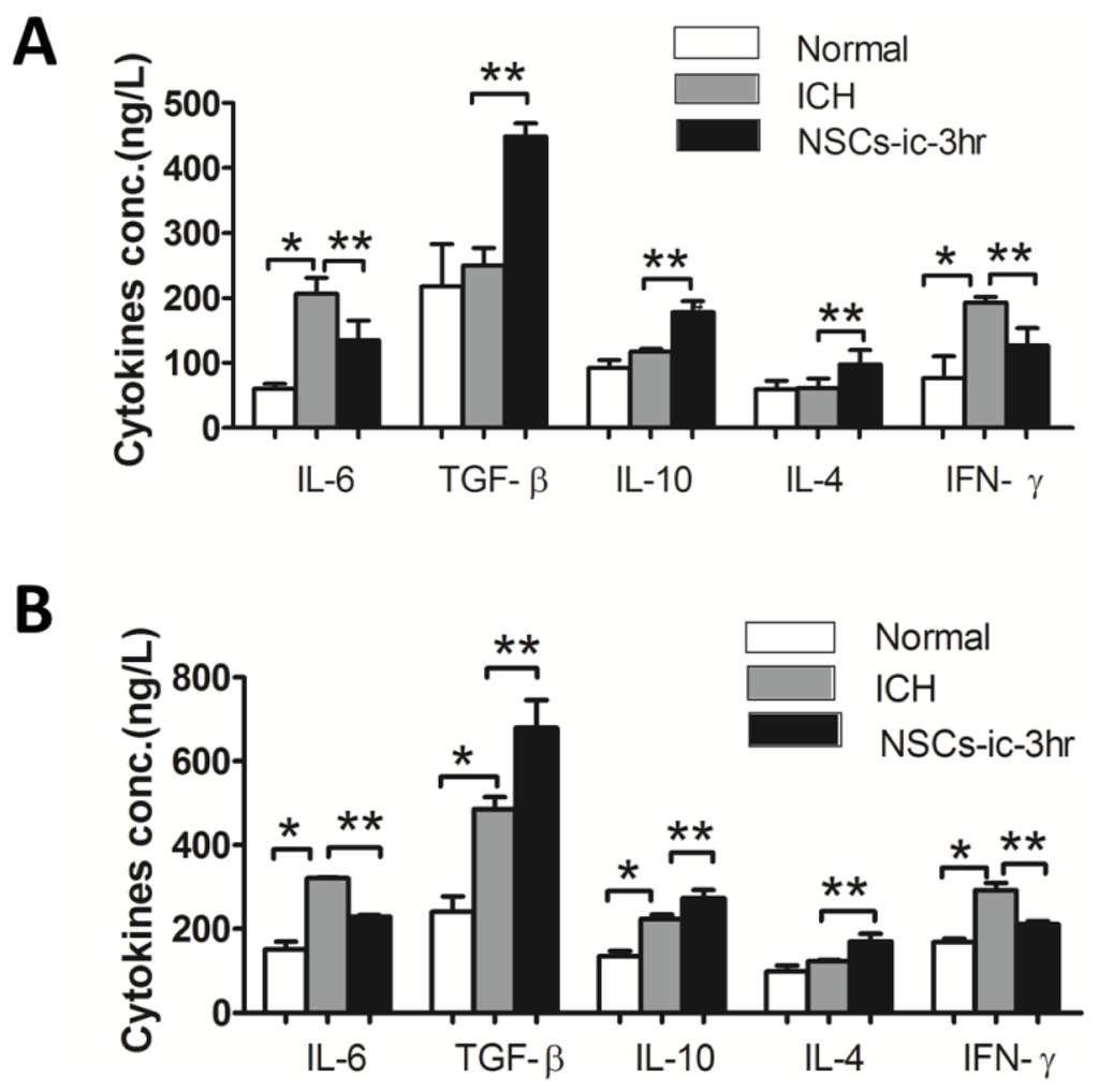 Finally, we investigated the levels of cytokines in the brain and peripheral blood 3 days after ICH followed NSC transplantation. As shown in Figure 5, IL-6 and IFN-γ were upregulated in the hemorrhagic brains and peripheral blood, compared to normal samples. TGF-β and IL-10 were increased in the peripheral blood. While IL-4 was unchanged both in the peripheral blood and brain after ICH.