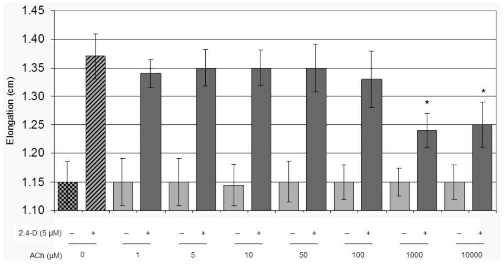 Effects of acetylcholine on tomato hypocotyl segments elongation. Hypocotyl segments were incubated for 16 h in buffer and increasing concentrations of acetylcholine (ACh) as indicated in the figure, with or without 5 μM 2,4-D. Hypocotyl segment length data are mean ± SE, n = 20. Group means were analysed by ANOVA followed by Tukey test (* p < 0.05).