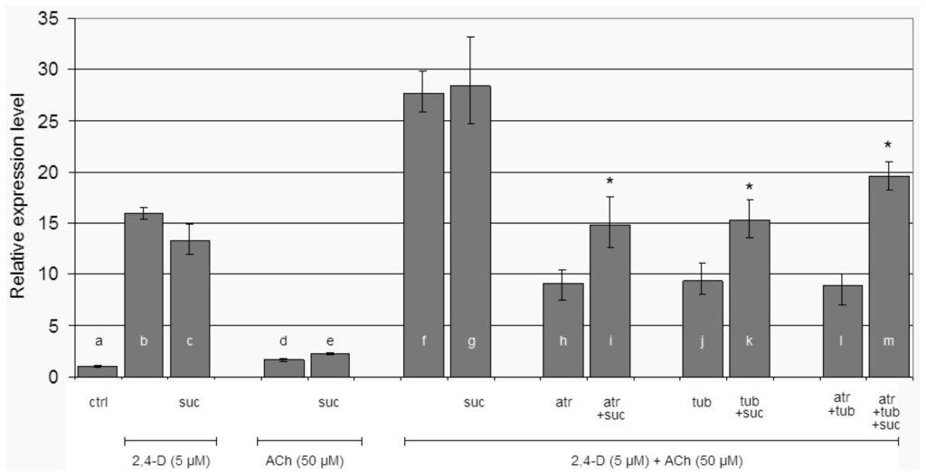 The specificity of ACh on gene induction was investigated by supplying two known antagonists of animal ACh receptors: atropine (atr) [50] and tubocurarine (tub) [51]. The observed effect was to decrease LeEXPA2 transcript to about 33% of the mRNA level registered in the relative control without antagonists (Figure 2, histograms h,j,l vs. f). LeEXPA2 mRNA was assessed to about 52% in presence of the single inhibitors when sucrose was added (Figure 2, histograms i,k vs. g), and to about 69% when the inhibitors were supplied together (Figure 2, histogram m vs. g). In all these last three different conditions (single inhibitors or the combination of both), sucrose statistically made the difference in maintaining expansin transcript.