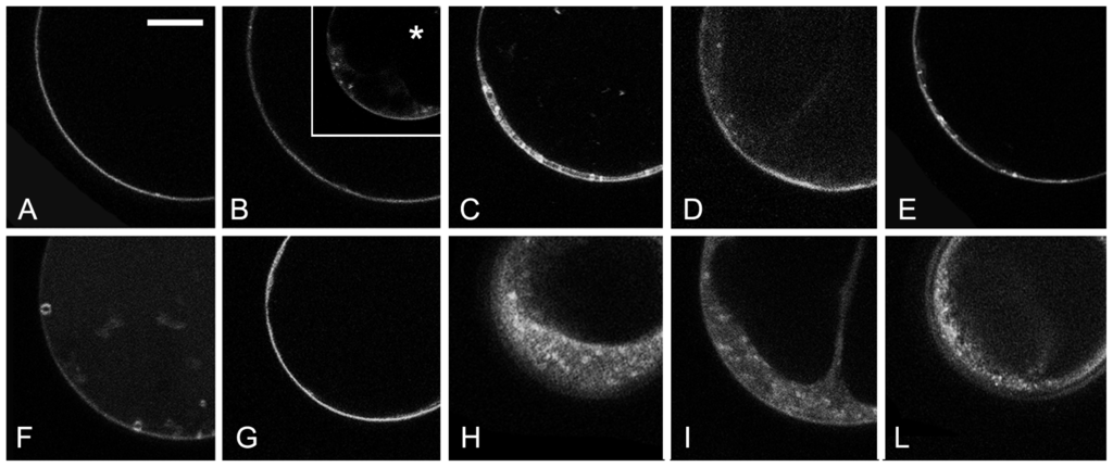 FM4-64 internalization in tomato hypocotyl protoplasts. (A–E) Images of protoplasts within the first 20 min of staining. (A) In control conditions labelling remained essentially limited to the PM in all large cells; (B) Effect of BFA treatment appeared to reduce FM4-64 internalization in large cells even if in small cells BFA bodies rapidly appeared (inset *); (C) Effect of treatment of protoplasts with 5 μM Auxin; (D) Effect of treatment with 50 μM ACh; and (E) Effect of combined chemicals; (F–L) Images of protoplast after 80 min of staining. (F) Control protoplast with defined late endosomes; (G) BFA treated cell with no internalization of the dye; (H) Protoplast treated with Auxin; (I) Protoplast treated with ACh; and (L) Protoplast treated with combined chemicals. Scale bar: 10 μm.